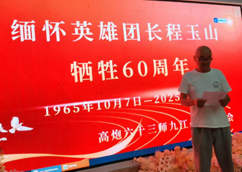 2025年10月7日,中国人民解放军原高炮第六十三师九江战友联谊会举办“缅怀英雄团长程玉山牺牲60周年”纪念活动。战友们相聚一堂,由“10.7”战斗亲历者,幸存者时任609团指挥所排长陈忠甫,介绍戎马一生的程玉山团长在援越抗美战场上英勇战斗的感人事迹。